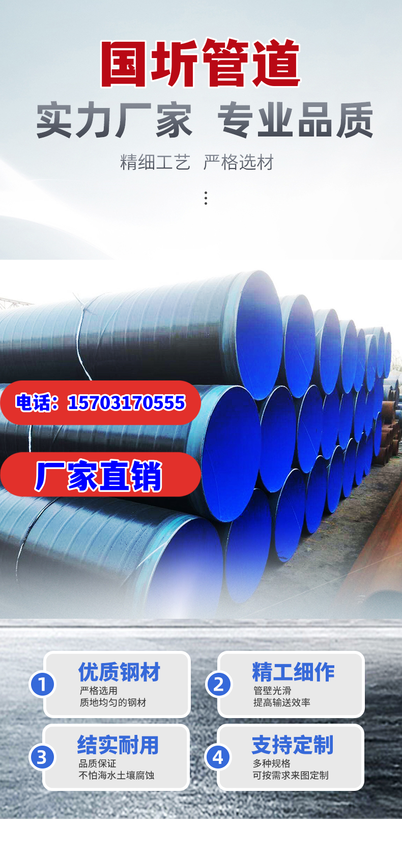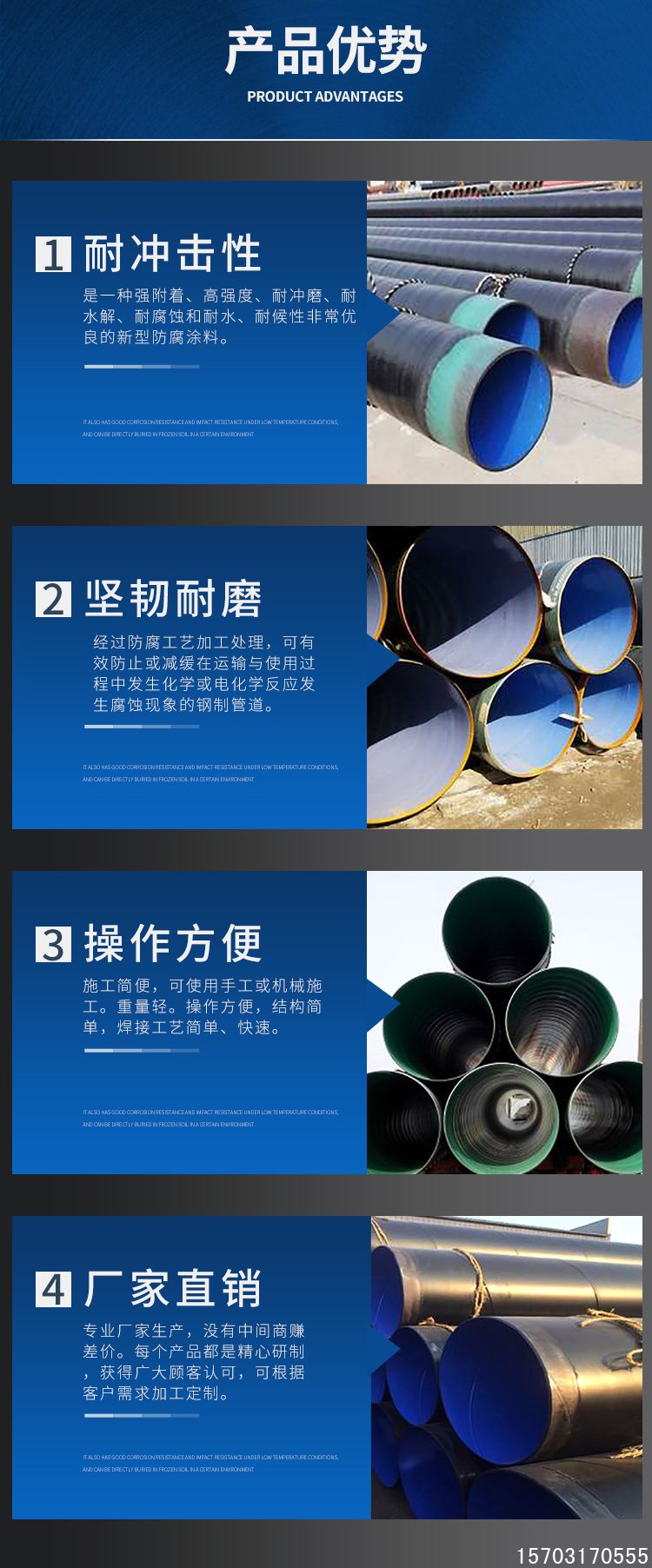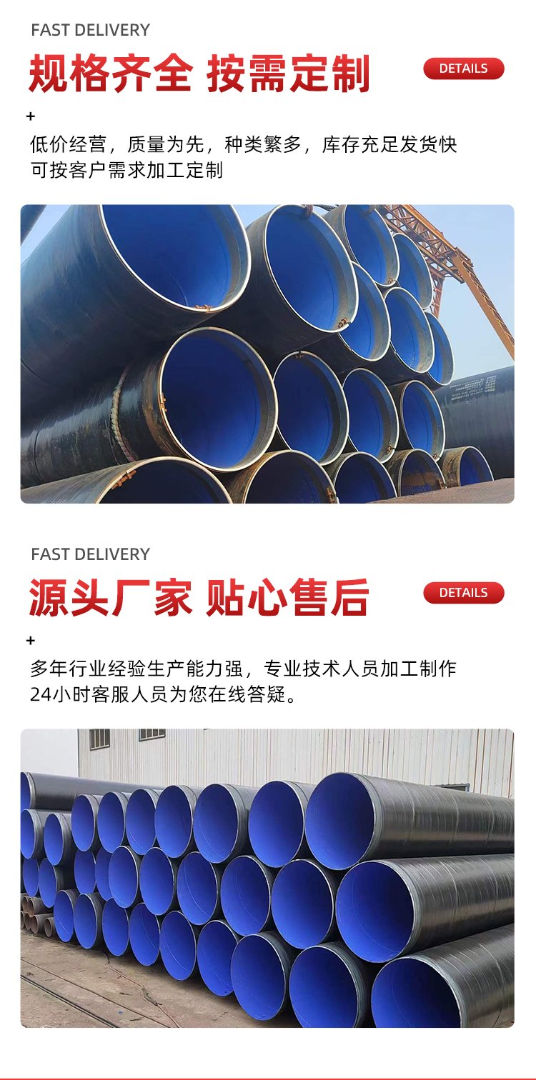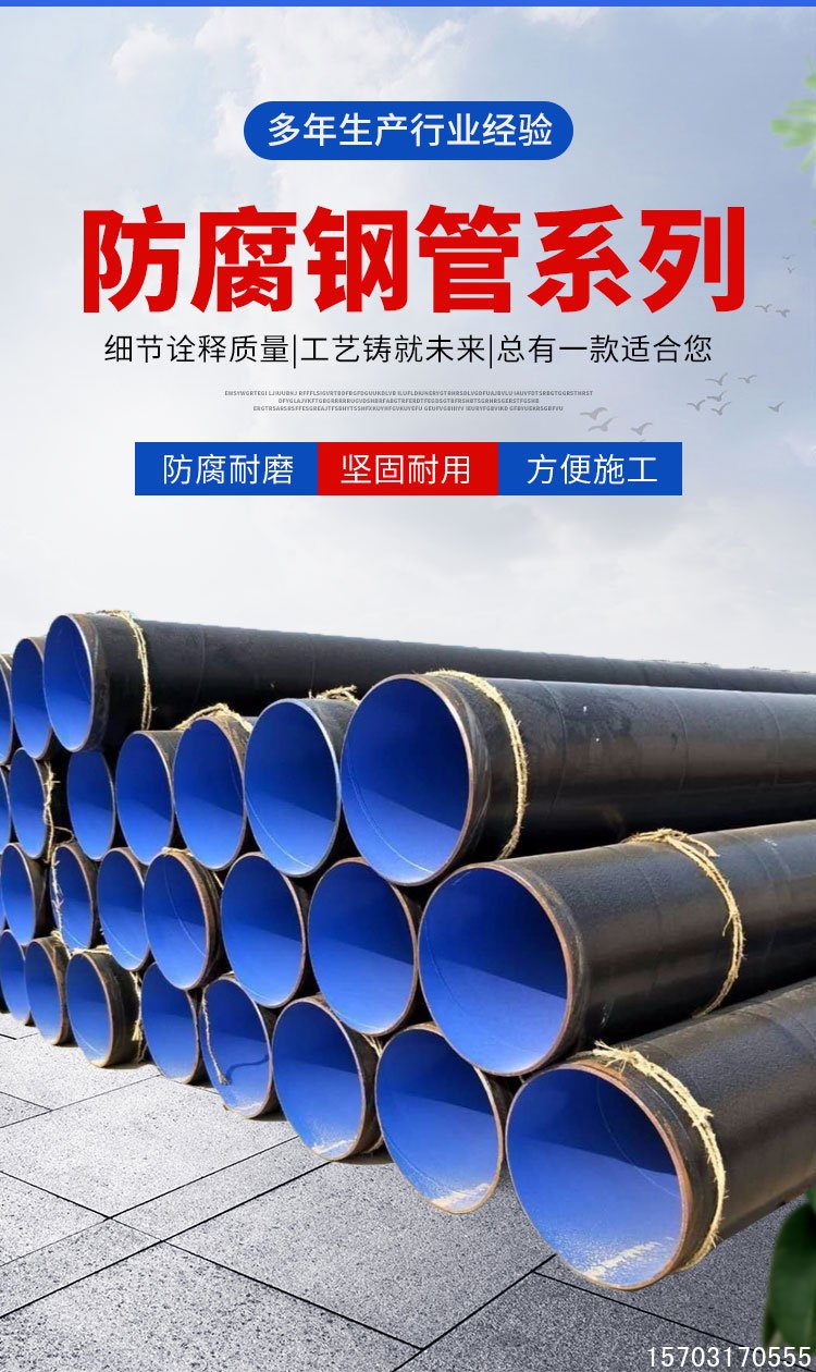 外壁采用熱熔結纏繞工藝底層環氧樹脂、中間層膠黏劑、外層聚乙烯形成三層結構的防腐層,內壁采用熱噴涂環氧粉末防腐方式,將粉末經高溫加熱熔結后均勻地涂敷在管體表面上,形成鋼塑復合層,極大提高了涂層附著力及涂層厚度,增強了耐磕碰,耐腐蝕的能力。