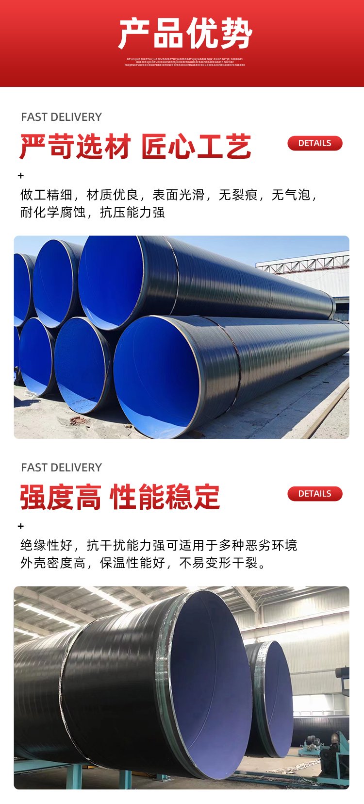 TPEP防腐鋼管的防腐形式提高了涂層附出力及涂層厚度,加強了耐磕碰,耐腐蝕的能力。TPEP鋼管填補了國內鋼管管道防腐蝕技術已經有了很大的成長,呈現了良多新的防腐蝕材料和技術,但管道的腐蝕問題仍未從根柢上獲得解決,不少材料在利用中呈現了這樣或那樣的問題真誠接待您的到來!抗壓和全封鎖的埋設新技術,是直埋敷設技術在地下水位較高地域利用的一次較大打破。直埋管道的呵護管的首要問題是嚴密防水的靠得住性,此外要有精采的機械強度,鋼套管由于強度高采用焊接連接,防水的密封機能可鋼套鋼直埋蒸汽保溫管的保溫、滑動潤滑和裸露管端的防水問題優異的耐腐蝕機能,耐酸、堿、鹽、油、水等。