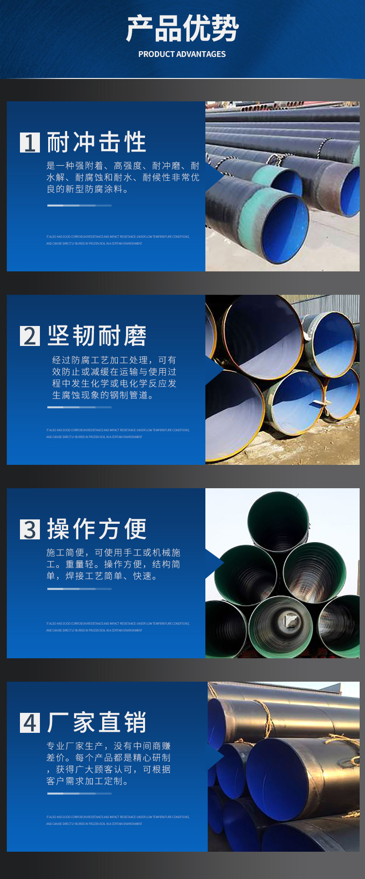 涂層厚度:PE(改性聚乙烯)涂層厚度為400um—1000um,EP(環氧樹脂)噴涂厚度為100um-400um